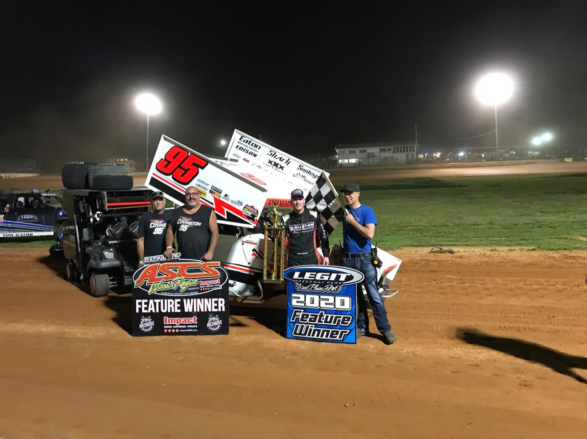 Topping the matchup between the Racinboys.com ASCS Warrior Region presented by Impact Signs, Awnings, and Wraps and the ASCS Mid-South Region at Legit Speedway Park, Covington's victory marks the first time he's topped the podium with the Warrior Region, and the second with the Mid-South Region.